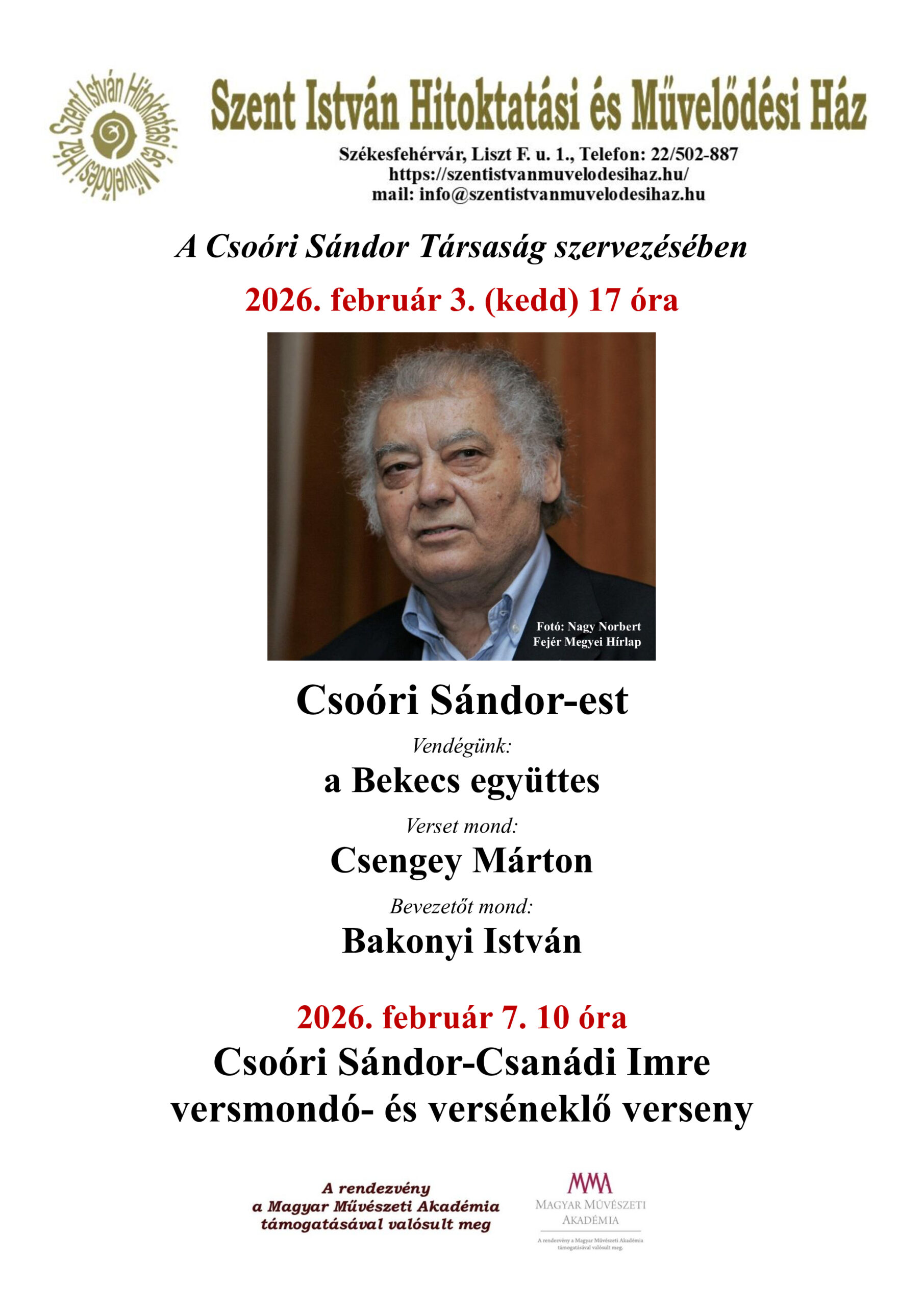 Február 6. (péntek) 17 óra Szent Korona Galéria Matyi József fafaragó „Kapolcsi Lajcsi Bácsik” című kiállításának megnyitója Megnyitja: Somogyi László református lelkész A kiállítás megtekinthető 2026. március 6-ig hétfőtől péntekig 10-17, szombaton 9-14 óráig