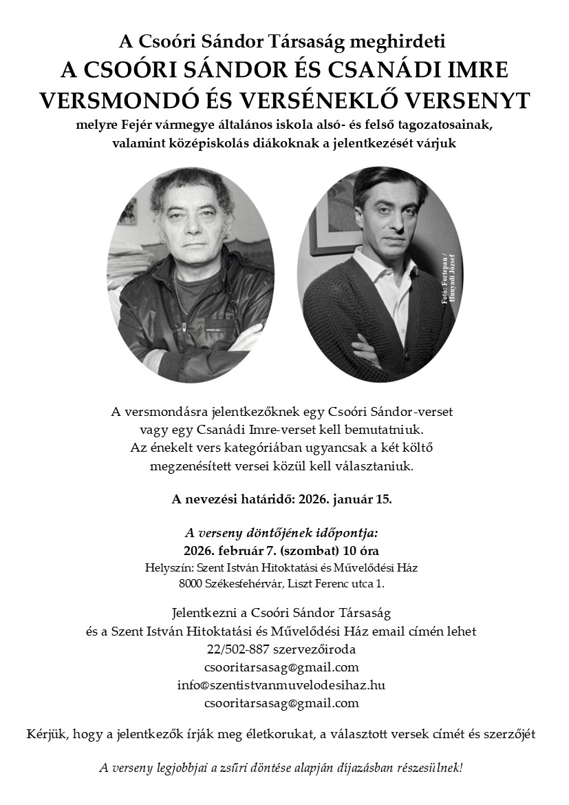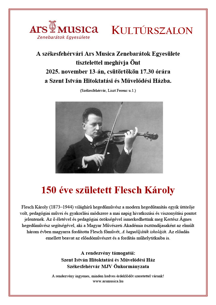 November 13. (csütörtök) 17.30 óra az Ars Musica Zenebarátok Egyesülete szervezésében 150 éve született Flesch Károly Flesch Károly (1873-1944) világhírű hegedűművész a modern hegedűtanítás egyik úttörője volt, pedagógiai művei és gyakorlási módszere a mai napig hivatkozási és viszonyítási pontot jelentenek. Az ő életével és pedagógiai örökségével ismerkedhetünk meg Kertész Ágnes hegedűművész segítségével, aki a Magyar […]
